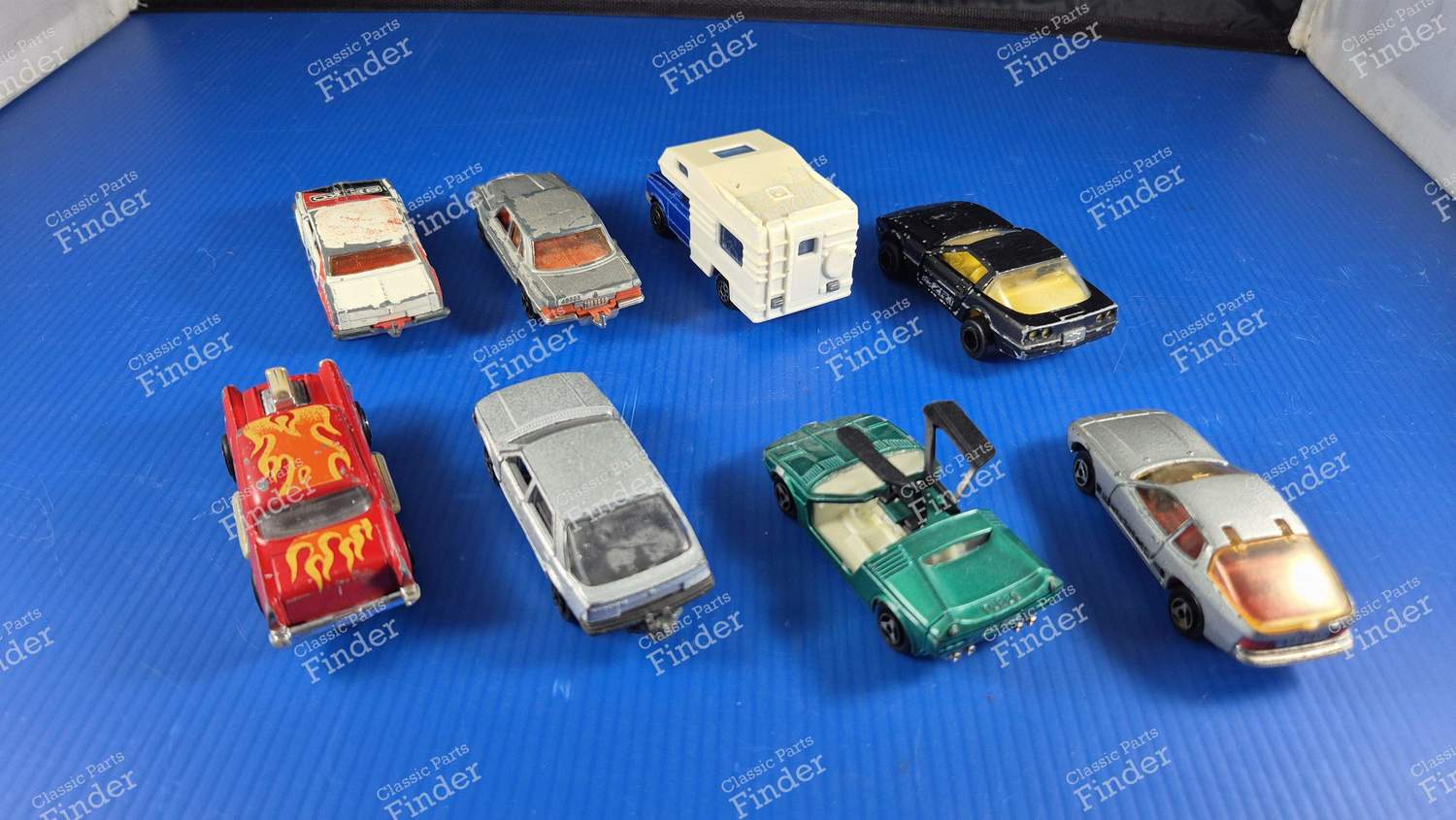 See the description in its original language (French) : Lot de 8 véhicules de marque 'MAJORETTES' anciennes. Complètes, légères traces d'usure sur les carrosserie, pares brise et lunettes arrière non cassées, une petite fissure visible sur le pare brise de la bmw et la lunette arrière de la R25, sinon le reste en bel état. Pas de roue cassées, châssis en métal, toutes les voitures ont été nettoyées pas de saleté à l'intérieur CHEVY 57 1/64 n°223 RENAULT R25 1/63 n°222 BMW TURBO M1 1/60 n°217 PORSCHE 924 1/60 n°247 CHEVROLET Corvette 1/57 n°268 OLDSMOBILE 1/75 n°253 MERCEDES 450 SE 1/60 n°249 CAMPING CAR 1/60 n°278