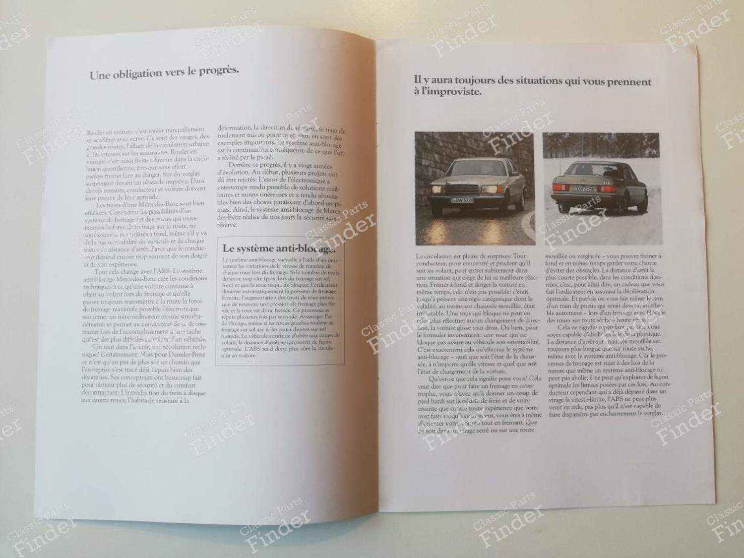 Brochure presenting the virtues and operation of the anti-lock braking system (ABS) Illustrations with the S-Class W126 version Language: French Year: 1981 Number of pages: 8 pages Very slight traces of use. Rather rare version, especially in French