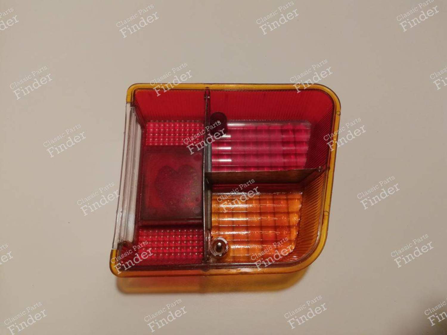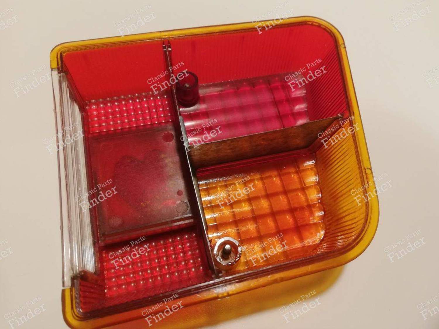 Linke Rückleuchte für Citroën Ami 6 (ab Anfang 1968) und Citroën 2CV ab dem Jahrgang 1970 bis zum Produktionsende. Originalteil, keine Neuanfertigung. Bemerkungen: -Von der Marke Seima (passt nur zu einem Plattenspieler der gleichen Marke). -Die Umrandung ist nicht verchromt. -Der Blinkerabschnitt war teilweise verblasst und wurde mit einer transparenten Spezialfarbe neu lackiert. Das Ergebnis ist nicht perfekt, aber durchaus zufriedenstellend. -Keine Risse, mit Ausnahme der Umrandung der Schrauben, die aber minimal ist.