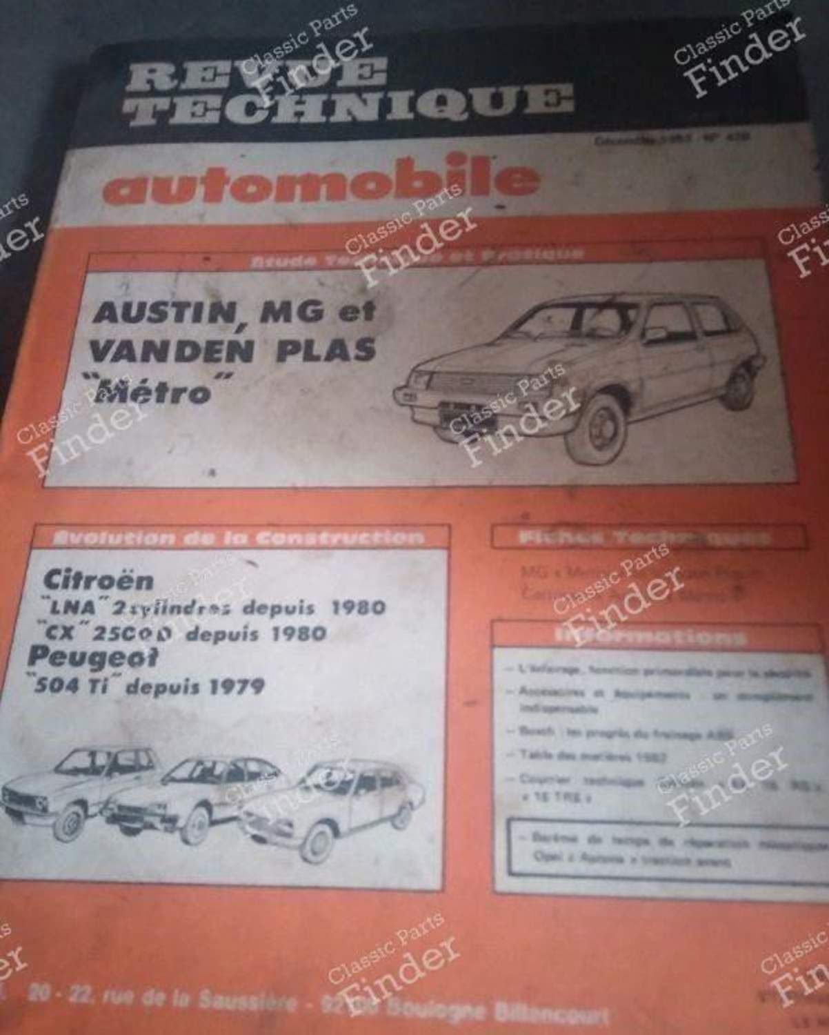 Die Classic Parts Finder Community bietet Ihnen eine Auswahl an Ersatzteilen für CITROËN CX, insbesondere das folgende Teil: Reparatur Anleitung in folgendem Zustand an: gut. Dieses Teil hat folgende Referenz N. 428 und wurde von E.T.A.I. hergestellt. Dieses Teil ist auch kompatibel mit: AUSTIN Metro (1980 - 1990), CITROËN LN / LNA (1976 - 1986), PEUGEOT 504 (1968 - 2005).