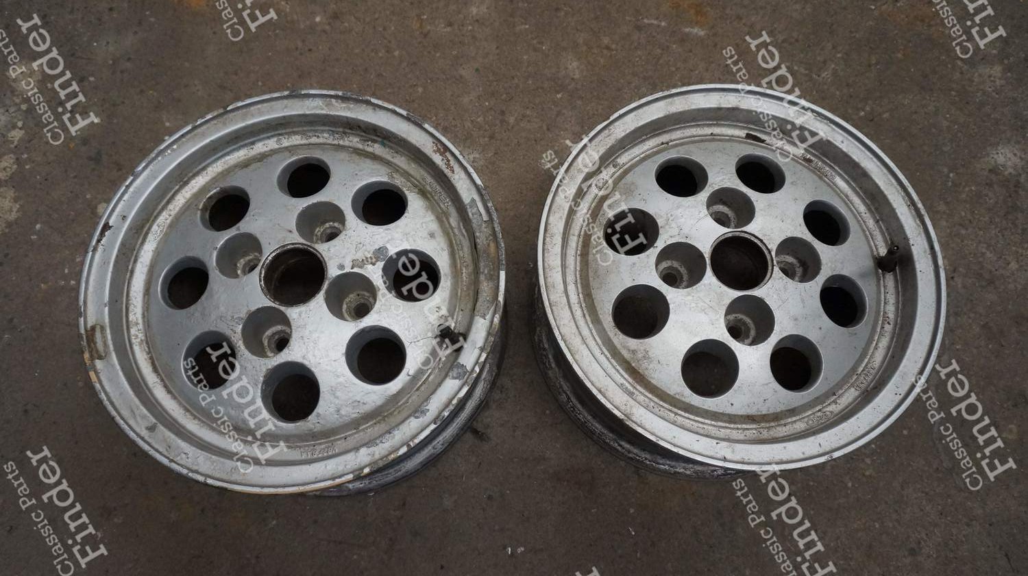 Zwei 'Pepperpot'-Felgen von Ford. Ohne zentrale Abdeckung. Früher auf Ford Capri montiert. Kann auch auf Ford Fiesta XR2 usw. passen (bitte die angegebenen Maße überprüfen).