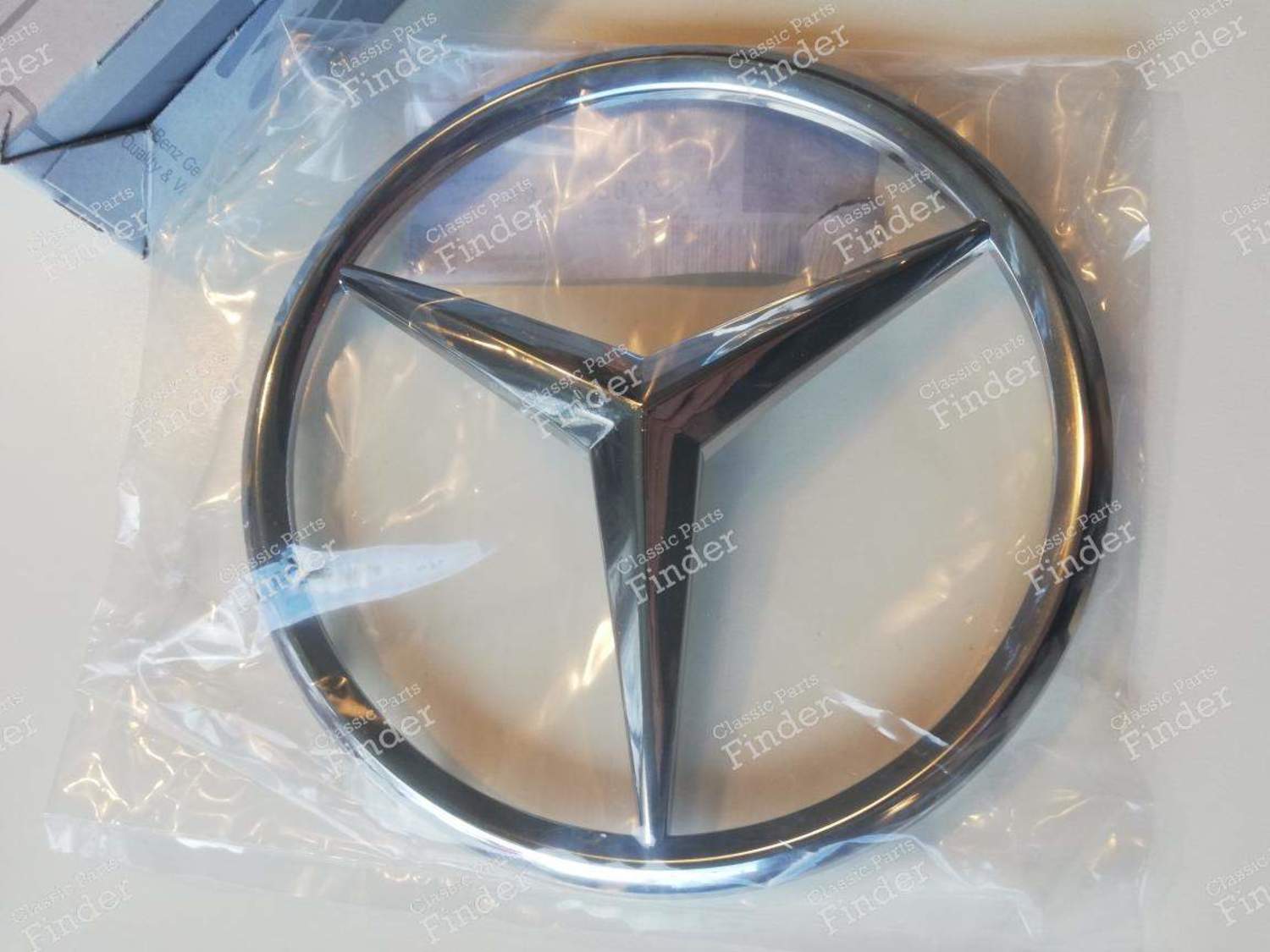Neuer Kühlergrillstern für das Modell R129 der ersten Generation (bis 1995 - Ref. 1298880286), in seiner Originalverpackung mit Mercedes-Stempel (ungeöffnete Plastikverpackung). Durchmesser ca.: 160mm Selten gewordenes Stück