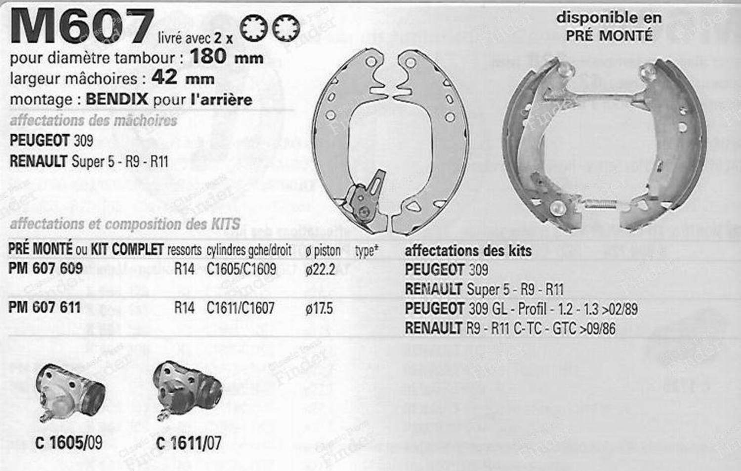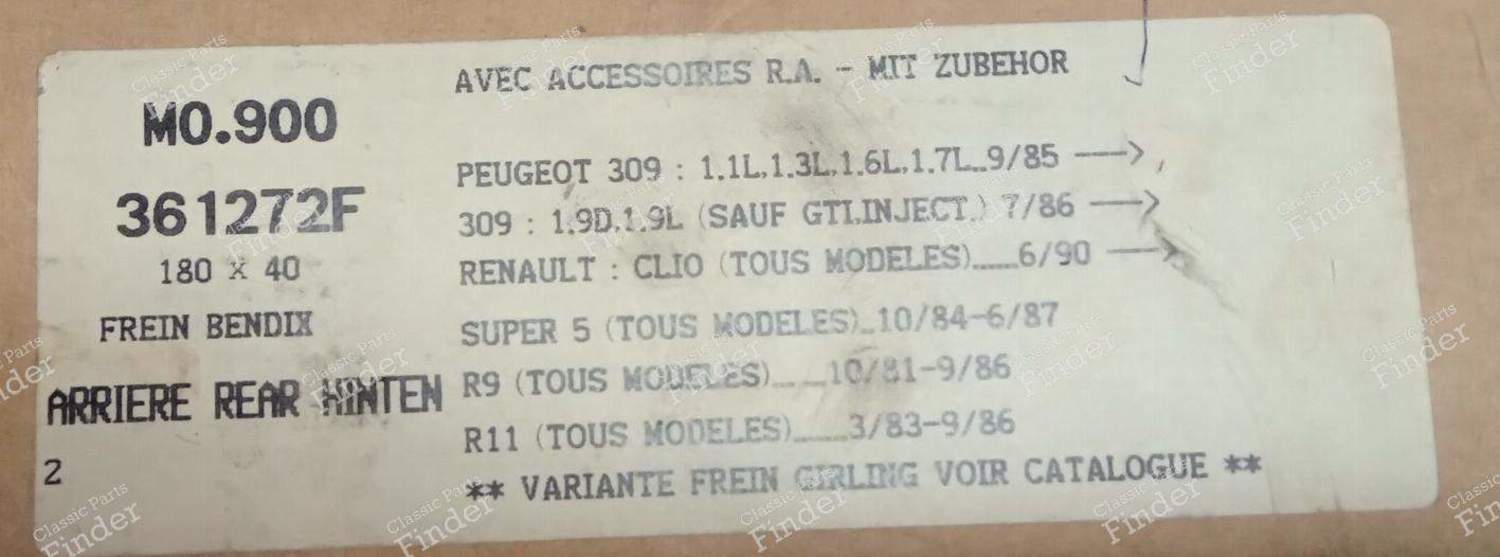 F E G MO 900 (MGA M607) 180x42 BENDIX-mounted drum Peugeot 309 GL GL PROFIL 1188cc 1294cc 1,6 1,9GT except GTi diesel from 9/85 to 2/89, Renault Super 5 C TC (B/C/S 400), L TL GL GTL (B/C/S 401), TL GTL (B/C 402), TS GTS TSE (B/C 403), T TD GTD (B/C/S 404), GTX (B/C 40G 408) from 10/84 to 6/86 R9 C TC GTC (B/C 421) TL GTL TLE (B/C 422) GTS TSE GTX TXE (B/C 423 426) TD GTD TDE (B/C 424) from 9/81 to 9/86 R11 TC GTC (B/C 371) TL GTL TLE (B/C 372) GTS TSE (B/C 373) TD GTD TDE (B/C 374) GTX TXE (BC 37G F N) from 12/82 to 9/86