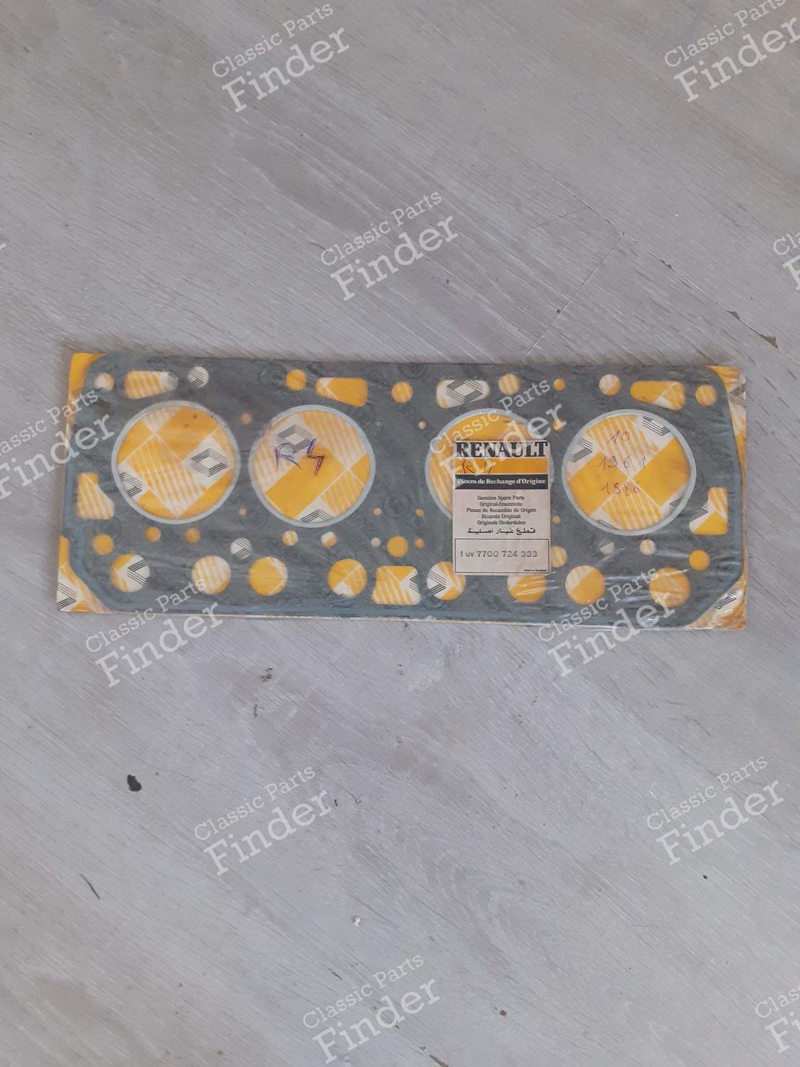 The Classic Parts Finder community offers you a selection of spare parts for your RENAULT 4 / 3 / F (R4), and in particular the following part: Engine gaskets in the following condition: as new. The part carries the reference 7700724333 and was made by Renault. This part is also compatible with: RENAULT 5 / 7 (R5 / Siete) (1972 - 1984), RENAULT 6 (R6) (1968 - 1980), RENAULT Rodéo 4 / 6 (1970 - 1981), RENAULT Dauphine / Ondine (1956 - 1970).