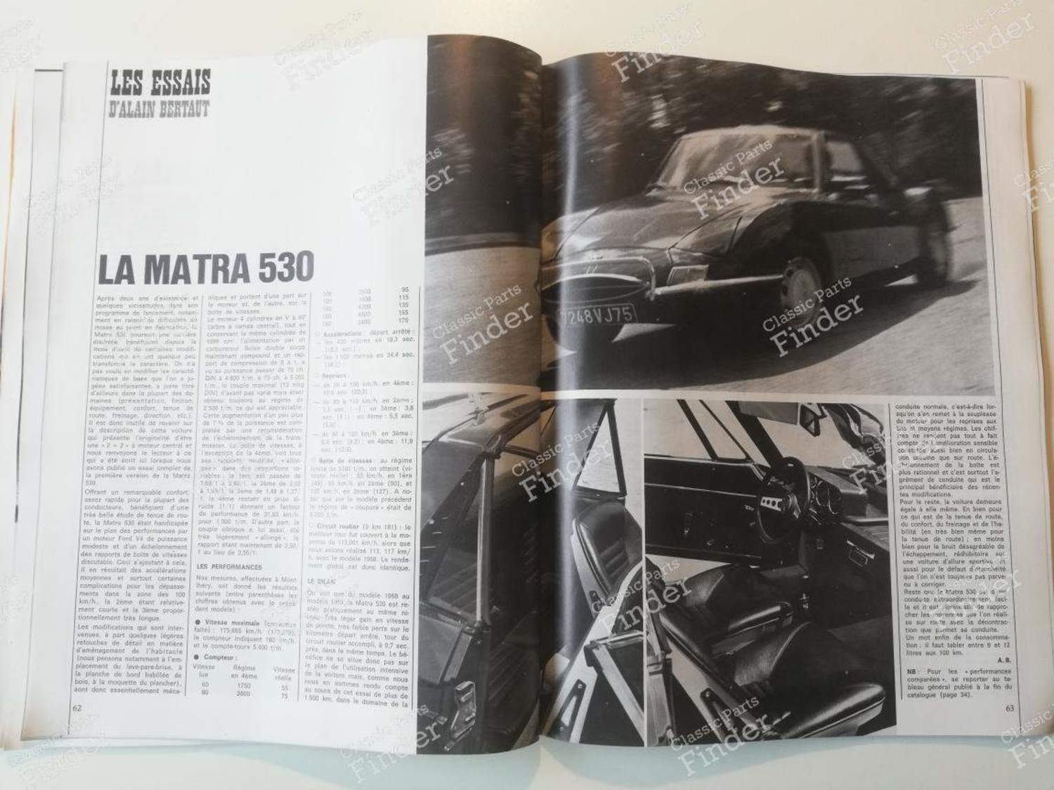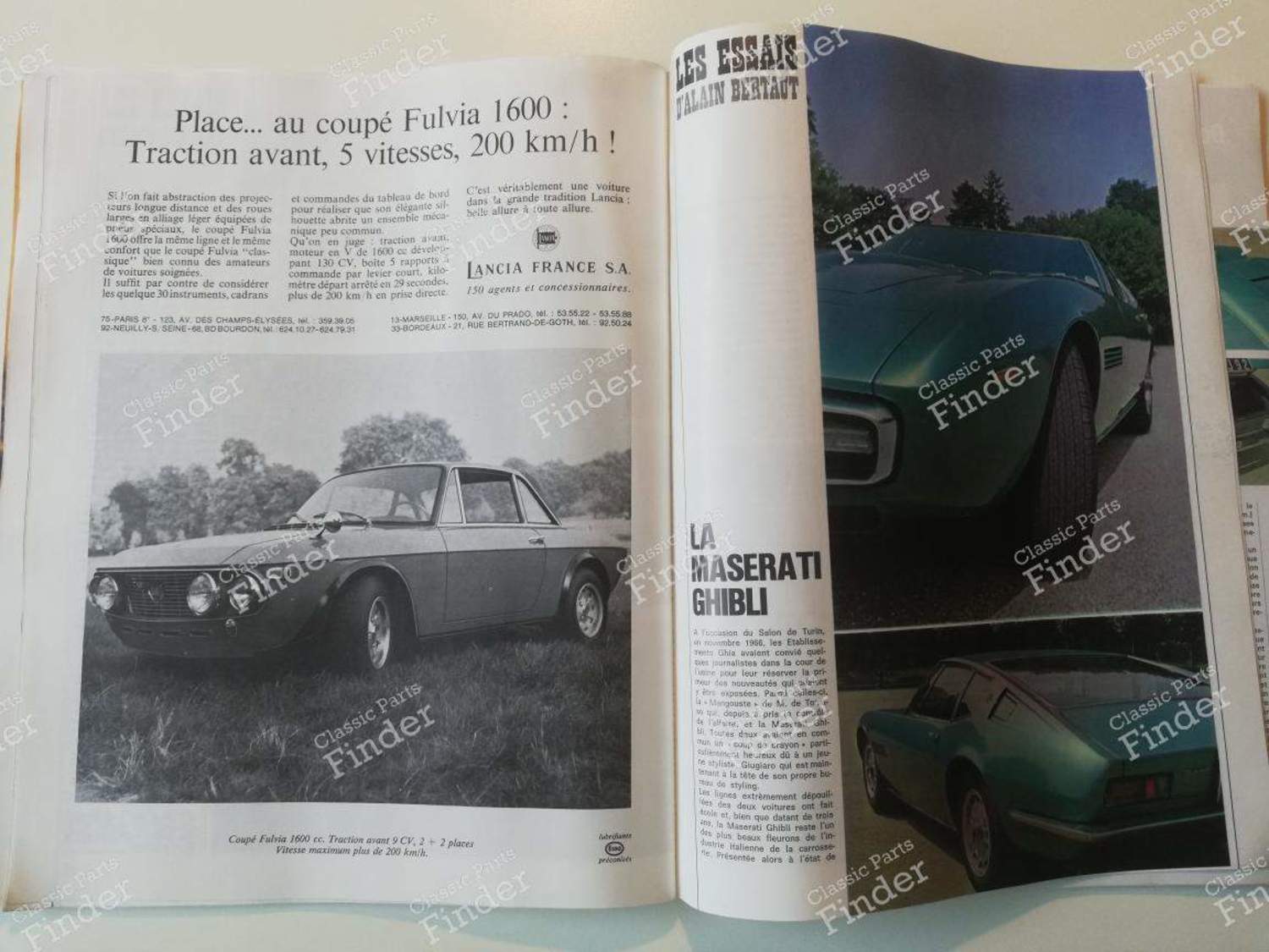 1969 Motor Show special, with all the sporty versions of the era, including the 'new' Ferrari 365 GTB/4. Comprehensive review, with technical specifications and new and used car prices. In French, 130 pages -Detailed tests: Peugeot 504 cabriolet Matra 530 Alfa Romeo Spider 1750 Duetto Maserati Ghibli -Commercials: Alfa Romeo GT VW-Porsche 914 (distributor) Ferrari Daytona (distributor) Maserati Ghibli (distributor) Opel Kadett 1100 SR Lancia Fulvia coupé CG B. 1200 R8 Gordini Ford Capri In addition: -Mercedes C111 prototype presentation -VW-Porsche 914 presentation -Announcement of new products, including Audi 100, electronic injection for the Citroën DS 21, Fiat 130, Opel Kapitän/Admiral, etc. -Article on the Renault 8 Gordini National Cup, Jacky Stewart, Derek Bell, Formula 3, Formula 1, Motorcycles, Boats The leaves are in very good condition, but are unfortunately detaching (very fragile glued binding). A fine magazine for discerning connoisseurs. Rather rare.