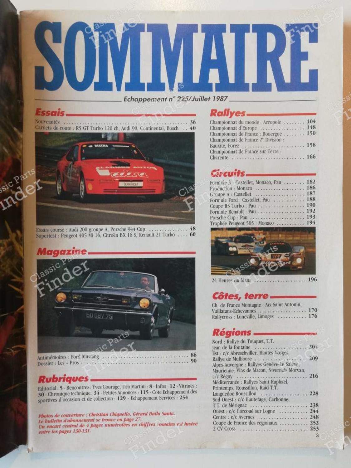 Revue 'Echappement' - Numéro 225 de Juillet 1987 (250 pages environ) Comprend notamment: -Essais: R5 GT Turbo 120ch Audi 90 Audi 200 groupe A Porsche 944 Cup Peugeot 405 Mi16 - Citroën BX 16S - Renault 21 Turbo Ford Mustang 1ère génération (essai 'rétro') -Rallyes: Acropole Championnat d'Europe Championnat de France (par régions) -Circuits: Formule 3 au Castellet, Monaco, Pau Super Production Groupe A Formule Ford Trophée 505 Coupe R5 ... -Publicités véhicules: Peugeot 205 (dont feuillet boutique Peugeot Talbot Sport) Ford Sierra Cosworth Autres: article sur l'évolution du système Bosch ABS et sa miniaturisation Bel état de conservation (aucune page de cornée ni déchirée) à l'exception de la couverture qui comporte quelques traces d'usage