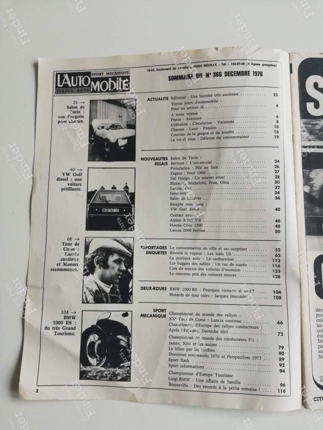 Numéro 366 de décembre 1976 Essai complet en 6 pages de la nouvelle Golf diesel Essais courts (2 pages) nouveautés Alpine A310 V6; Honda Civic 1500; Lancia Beta 2000 Annonces nouveautés salons de Turin et Londres (dont annonce Aston Martin Lagonda, et Innocenti Mini De Tomaso Publicités: -CX Diesel -Opel Manta -Moteur V6 Renault (!) -Peugeot 504 (2 pages) Pages parfois un peu cornées, mais bon état d'usage.